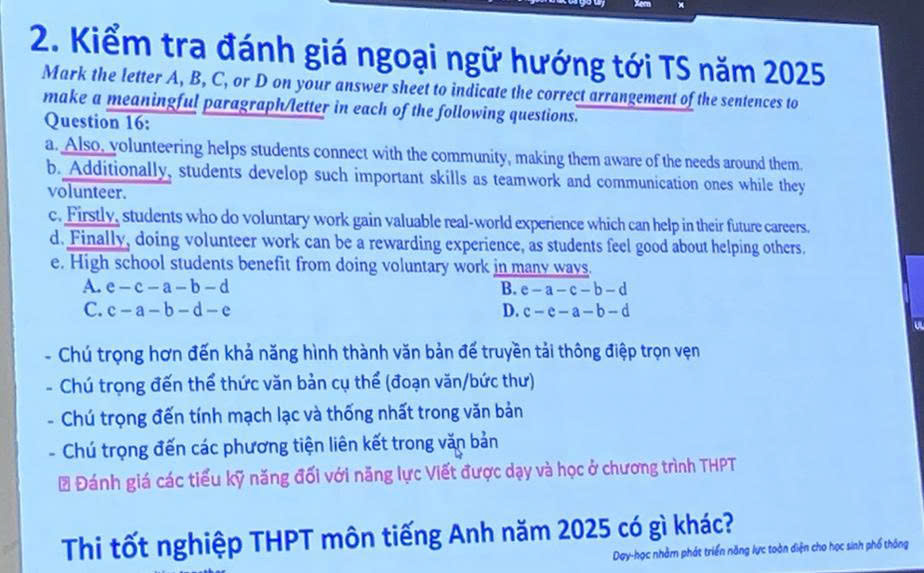 • Ví dụ trong đề minh họa: Đề bài đưa ra 4 câu rời rạc về lợi ích của hoạt động tình nguyện. Thí sinh phải sắp xếp chúng theo một trình tự logic để tạo thành một đoạn văn hoàn chỉnh.